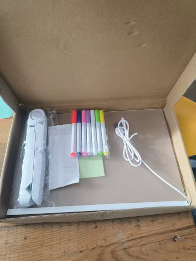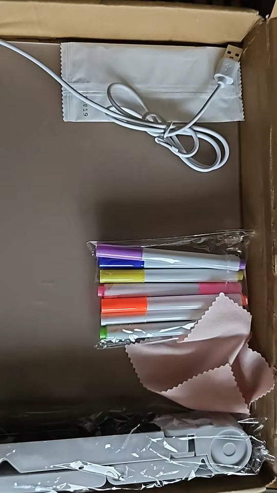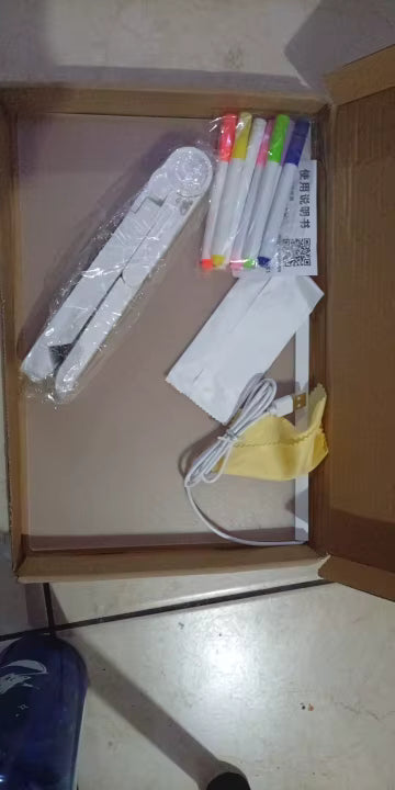 Brettet lyser opp når det kobles til med USB. Barnet tegner direkte på overflaten med tusjene.