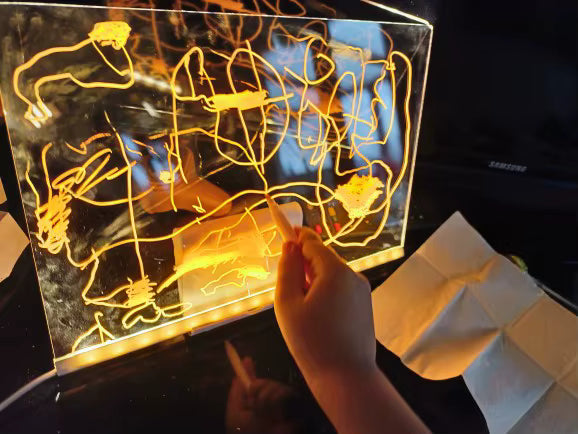 Dette tegnebrettet med lys gir barnet en enkel og rolig måte å tegne og leke på – uten skjerm.